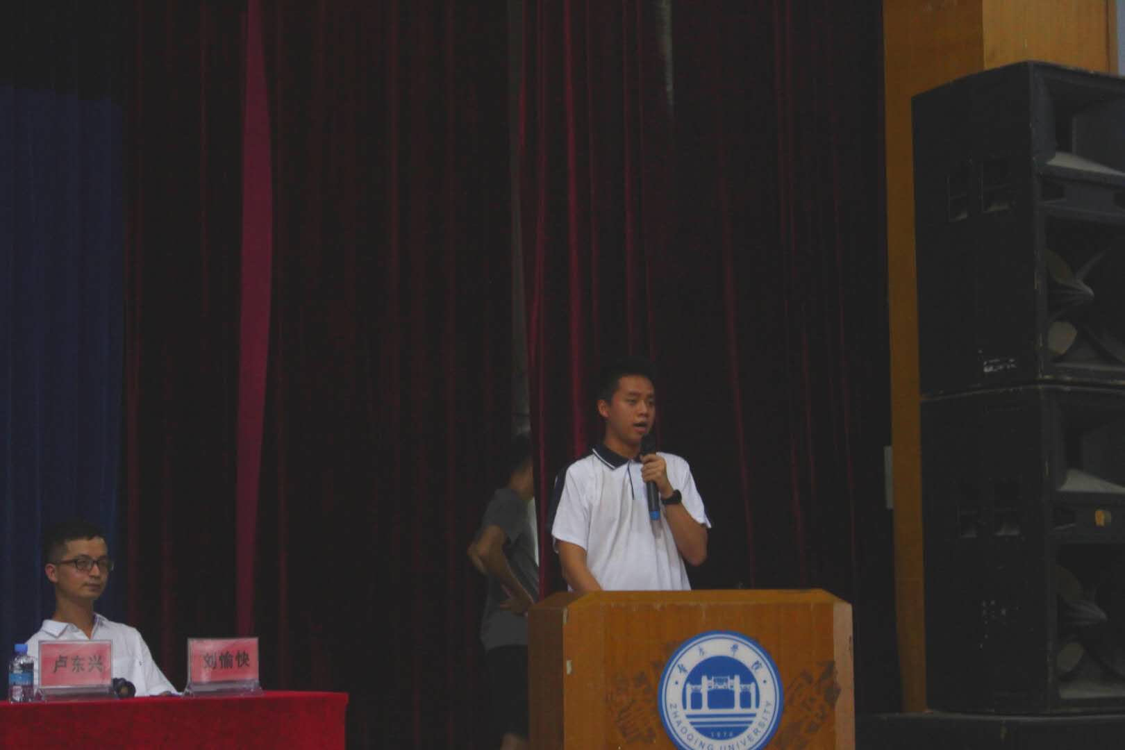 接着主持人介绍出席典礼的领导和老师,并宣读大会议程。本次典礼的主要议程有:一是学院教师代表刘愉快博士发言;二是老生代表朱镓宏同学发言;三是新生代表容一博同学发言;四是请学院党委书记黄伟致辞;五是学院院长陈英俊讲话并作校史院史介绍。