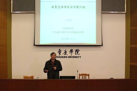 本网讯(记者 杨咏淇 郭碧琪)为了增强我院学子对物理前沿的认识,12月20日下午,我院特邀了华南师范大学物理与电信工程学院凝聚态物理研究所所长、珠江学者王瑞强教授为主讲人,在校图书馆学术报告厅开展了“凝聚态物理前沿专题介绍”为主题的讲座。