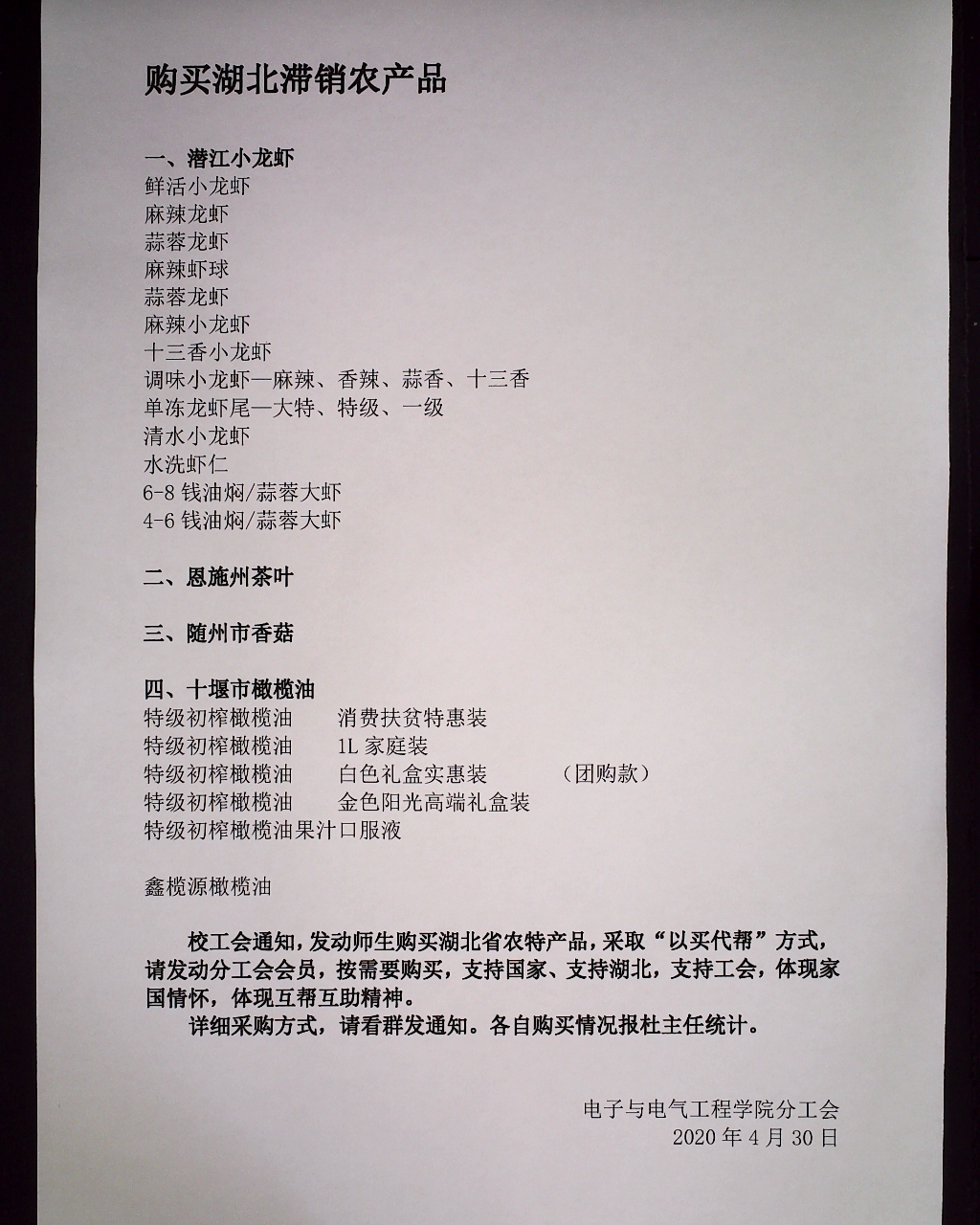 校工会通知,发动师生购买湖北省农特产品,采取“以买代帮”方式,请发动分工会会员和学生,按需要购买,支持国家、支持湖北,支持工会,体现家国情怀,体现互帮互助精神。