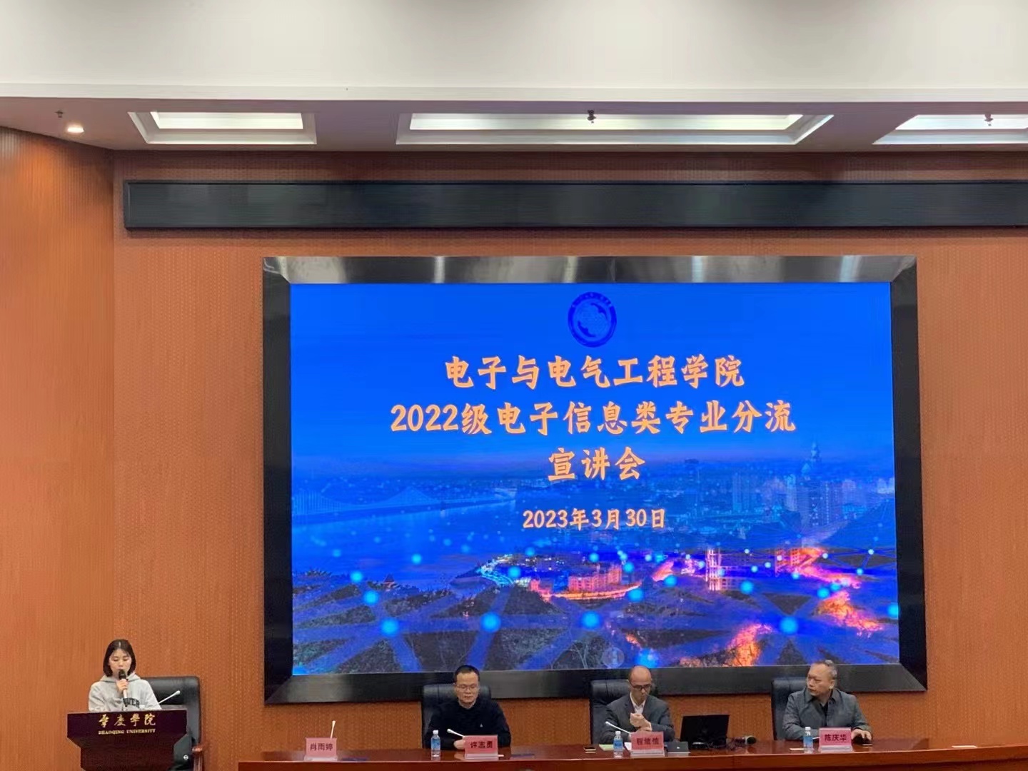 2023年3月30日晚19:30——21:30,我院在校图书馆学术报告厅召开了2022级电子信息类专业大类分流宣讲会,旨在使学生更好地了解各分流专业的特色及分流方式,切实做好后续的大类招生专业分流工作。我院教学副院长程绪信、电子信息科学与技术专业负责人陈庆华、电子科学与技术专业负责人许志勇、学院教务秘书肖雨婷出席了本次会议,2022级电子信息类专业全体同学约220人到场参会。