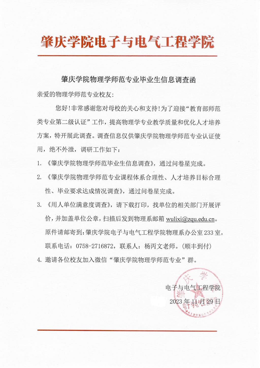 1. williamhill威廉希尔官网物理学师范毕业生信息调查表,通过问卷星完成https://www.wjx.cn/vm/PSh5eia.aspx#。问卷中工作后所获得的个人荣誉(个人荣誉、获奖证书、职称证书等材料的电子版,发至邮箱wulixi@zqu.edu.cn)