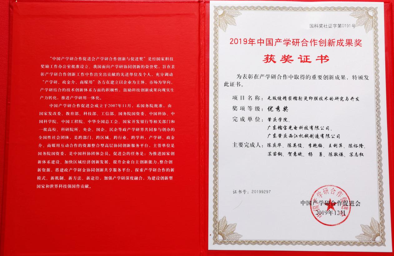近日,中国产学研合作促进会公示了2019年中国产学研合作创新与促进奖获奖项目,我院陈庆华、陈英俊、李艳梅、王利萍、陈裕隆申报的项目“无版缝精密镭射烫印膜技术的研究与开发”获2019年中国产学研合作创新成果奖三等奖(williamhill威廉希尔官网为申报单位,广东镭宝光电科技有限公司、广东省肇庆西江机械制造有限公司为合作完成单位),实现了学校在国家级产学研合作创新与促进奖上的零的突破。