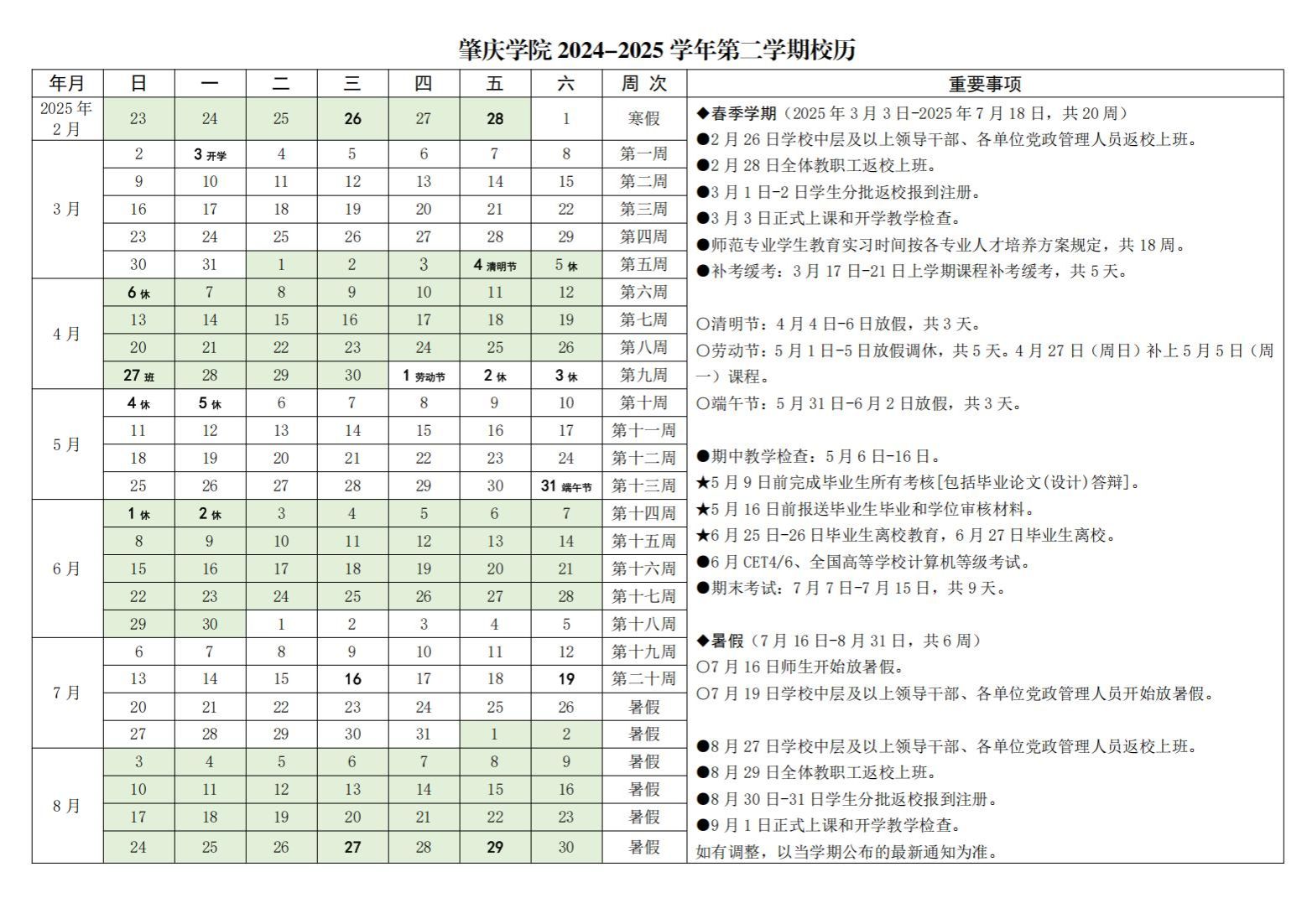 2024-2025学年第二学期校历(2025.2-2025.8)