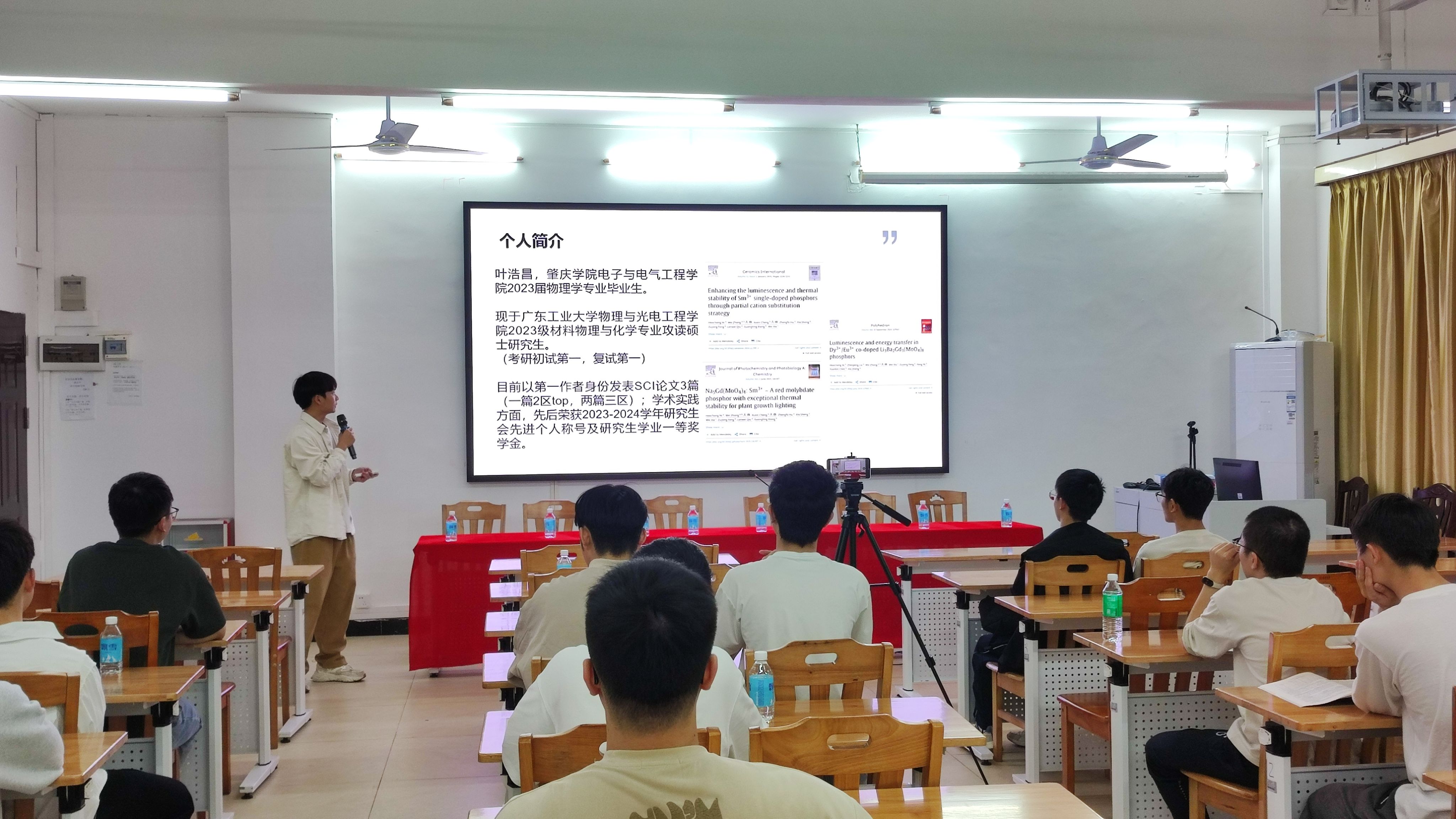 特邀嘉宾——广东工业大学博士、硕士生导师张伟为学生做考研复试指导,他结合多年复试指导经验,系统解析复试流程、导师关注点及高频问题应对策略,为考生提供科学备考框架。我校2023届校友、广东工业大学材料物理与化学研究生叶浩昌专程回母校分享复试经验。另外,我院2024级研究生夏文辉、窦振浩、郑江涛分别分享复试心得,覆盖材料准备、模拟考试、心态调整和注意事项等关键环节。交流会通过“理论+案例+互动”三位一体模式,为考生搭建起复试备考“快车道”。参会研考学生表示,导师的方向指导与学长的实战经验结合,有效缓解了复试焦虑,明确了备考方向。