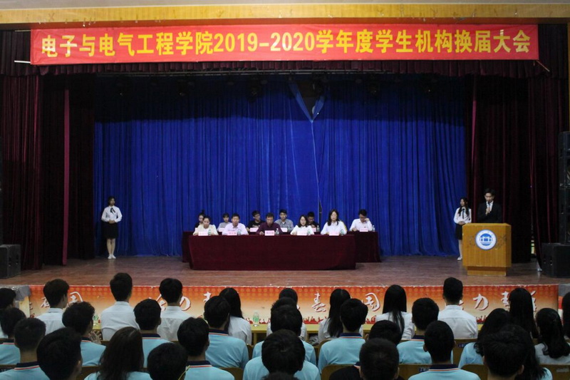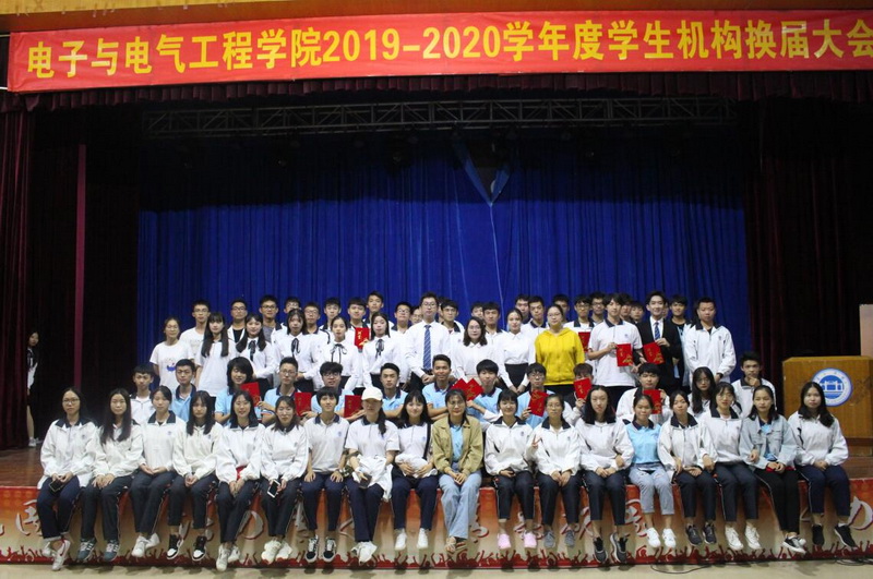 本网讯 2019年11月16日晚,电子学院学生机构换届表彰大会在学生活动中心大礼堂隆重召开。院党委副书记傅汉球、学院辅导员郑安徽、袁如文、刘浏、张聪慧等老师出席本次会议;校学生会执行主席郑佳辉,院学生机构全体学生干部和2019级全体学生参加本次会议。