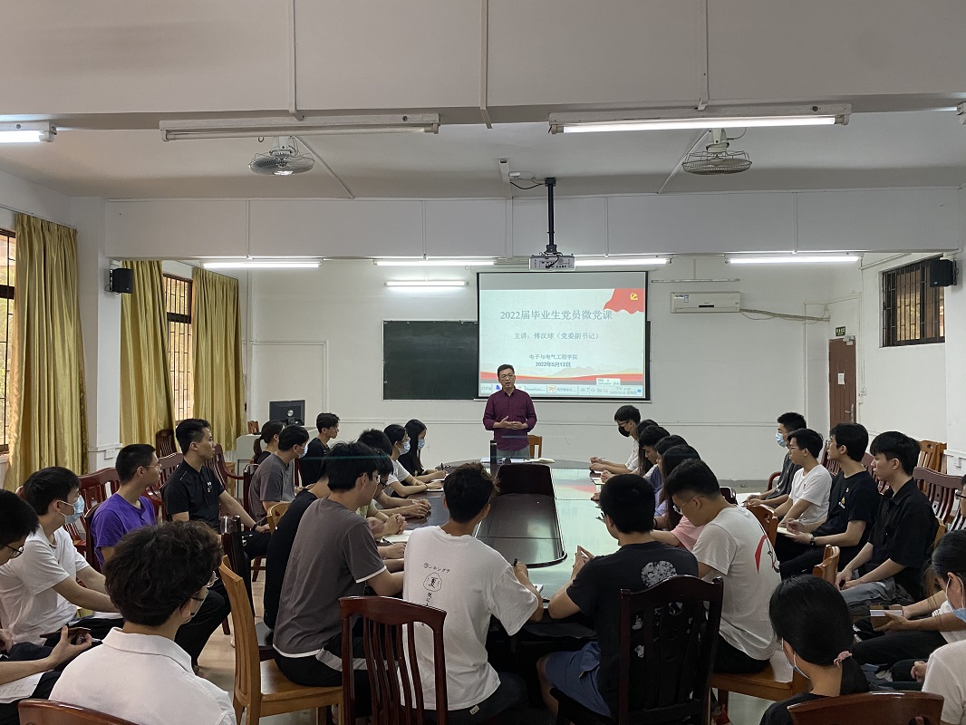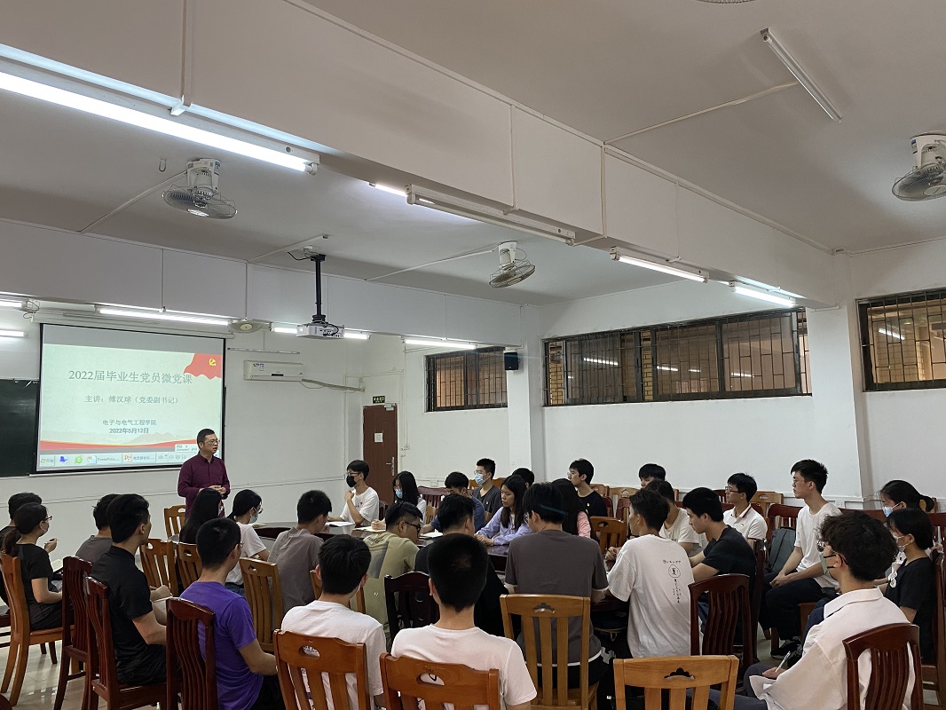 (通讯员 赖钧苏)2022年5月12日下午,我院党委组织2022届毕业生党员在实验楼208会议室上微党课和开展毕业安全教育工作。党课由我院党委副书记傅汉球主讲,专职组织员、在校毕业生党员共30多人参加。党课主要内容是学习习近平总书记在“庆祝中国共产主义青年团成立100周年大会”的重要讲话,分享感受体会和学习心得,学习习近平总书记“青年观”等内容,观看相关视频,同时开展毕业教育、安全教育、毕业离校教育等,形式灵活多样,课堂效果好。
