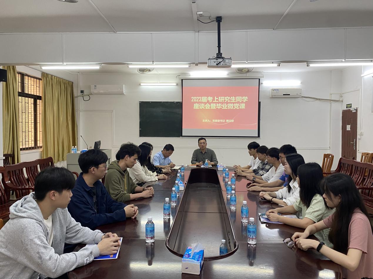 【本网讯】4月24日下午,我院在学院208会议室召开毕业生考研成功座谈会暨毕业生微党课。学院党委副书记傅汉球参加会议并讲微党课,辅导员郑安徽主持,参加人员有考研成功毕业生、学生党员、入党积极分子代表等。