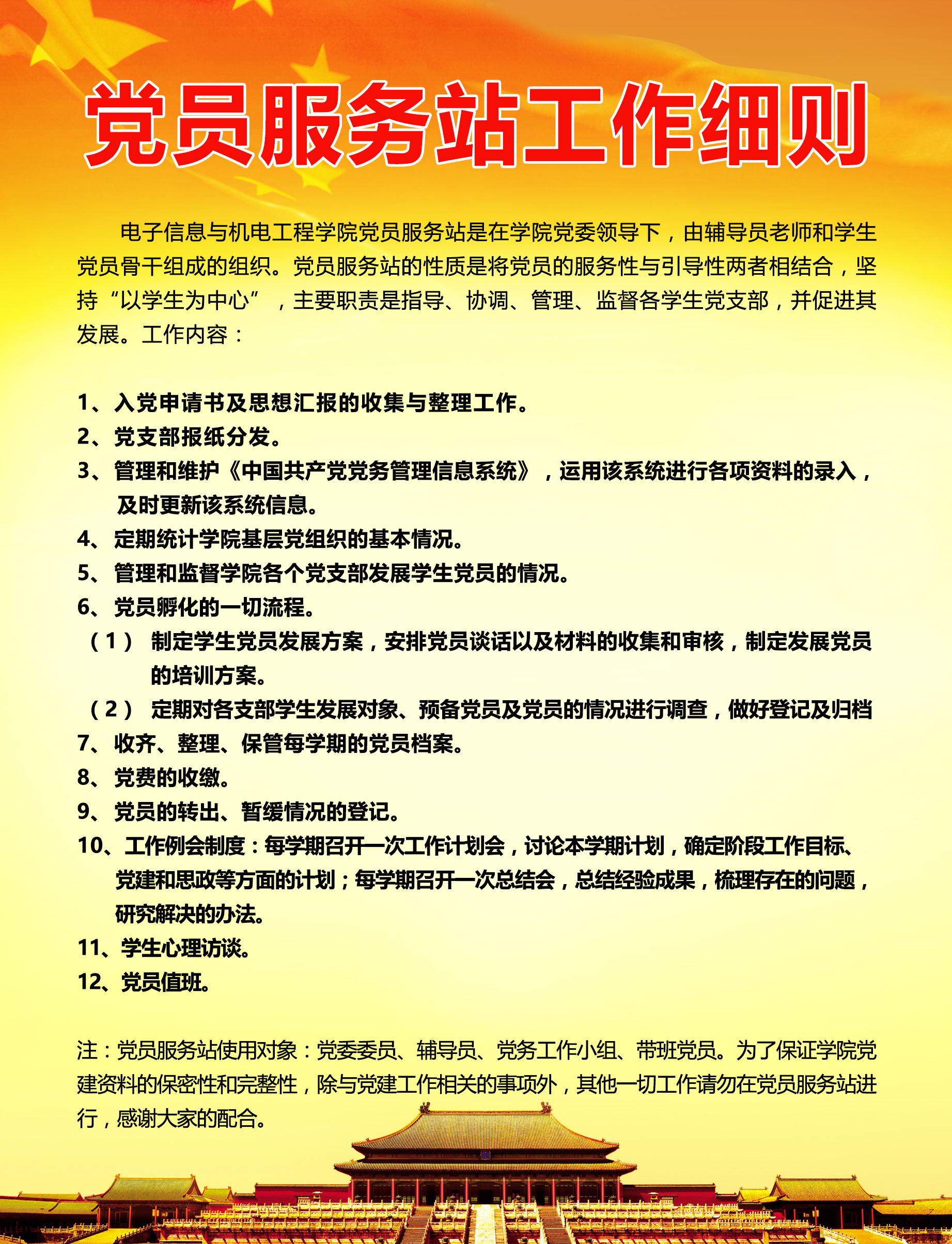 注:党员服务站使用对象:党委委员、辅导员、党务工作小组、带班党员。为了保证学院党建资料的保密性和完整性,除与党建工作相关的事项外,其他一切工作请勿在党员服务站进行,感谢大家的配合。