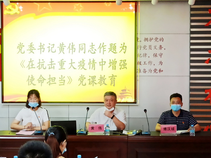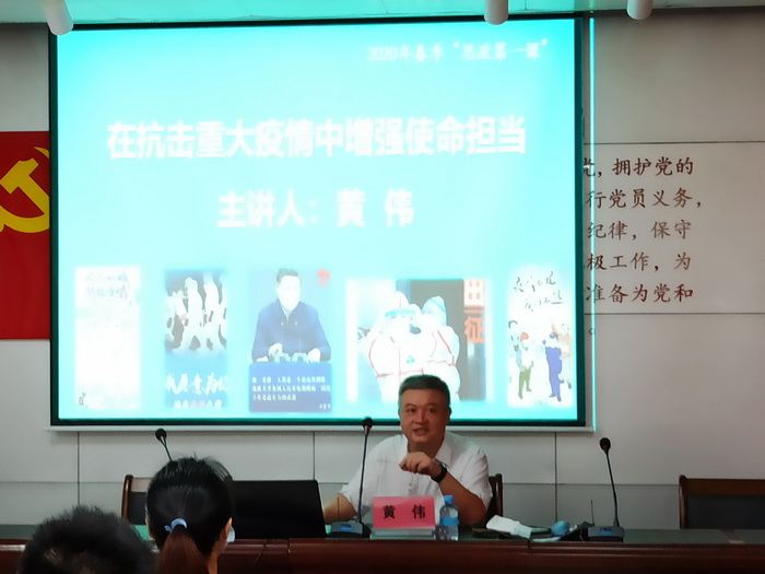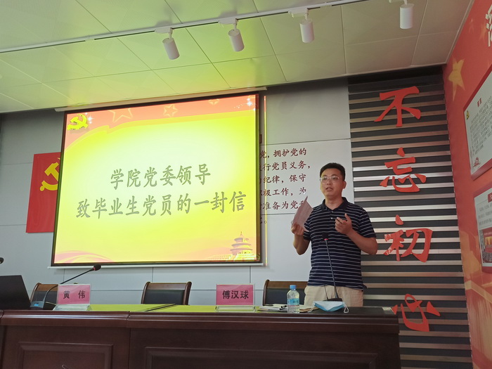 会上,黄书记首先带领大家重温了入党誓词,接着为毕业生党员讲授了题为《在抗击重大疫情中增强使命担当》的党课,并在之后对毕业生党员们深情地读出了学院党委写给毕业生党员的一封信。黄书记强调,各位毕业生党员要继续紧密地团结在以习近平同志为核心的党中央周围,奋发有为,锐意进取,在疫情中发挥党员的先锋模范作用,在生活中继续不忘“为人民服务”的宗旨,牢记 “厚德、明智、博学、力行”的校训,胸怀大志,踏实走好人生征途中的每一步。