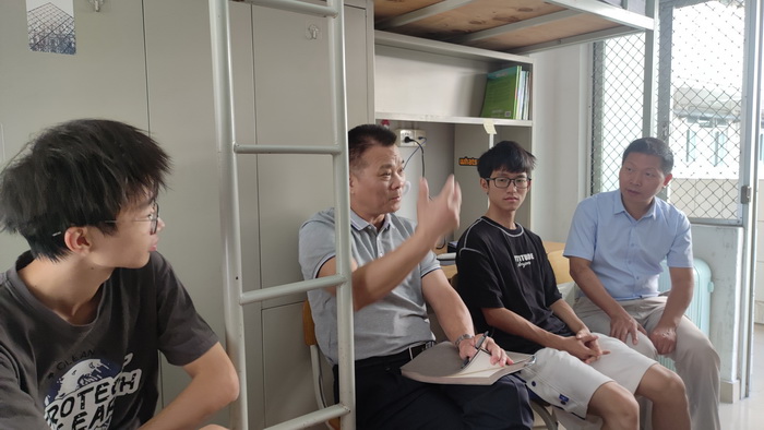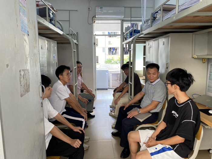 本网讯:10月26日上午8点30时,广工帮扶队队长刘怡军一早深入基层联系学生,走访williamhill威廉希尔官网22级物理学1班学生宿舍。williamhill威廉希尔官网党委副书记傅汉球,辅导员郑安徽、刘浏陪同走访。