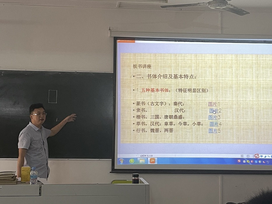 培训讲座主要内容有四个方面:一是五种基本书体介绍及基本特点说明,分别介绍了篆、隶、楷、行和草五种基本书体;二是讲述了写好粉笔字的基本要求和好的标准;三是讲述写好粉笔字的具体内容,如执笔姿势、字形结构、笔画写法等;四是讲述了几种常用字符(字母、数字、公式)的板书要求。
