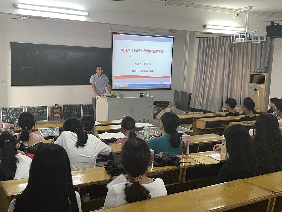 本网讯(通讯员 梁铭贤)自党史学习教育开展以来, williamhill威廉希尔官网积极开展“我为群众办实事” 实践活动, 牢固树立以人民为中心的发展思想,不断提升服务质量,结合我院物理学(师范)专业大三学生准备实习要求,我院于5月27日在实验大楼208举行了“谈如何写好粉笔字——板书讲座”培训活动。讲座由学院党委副书记傅汉球主讲,参与人员有18级物理班师范生、物理系教师代表。