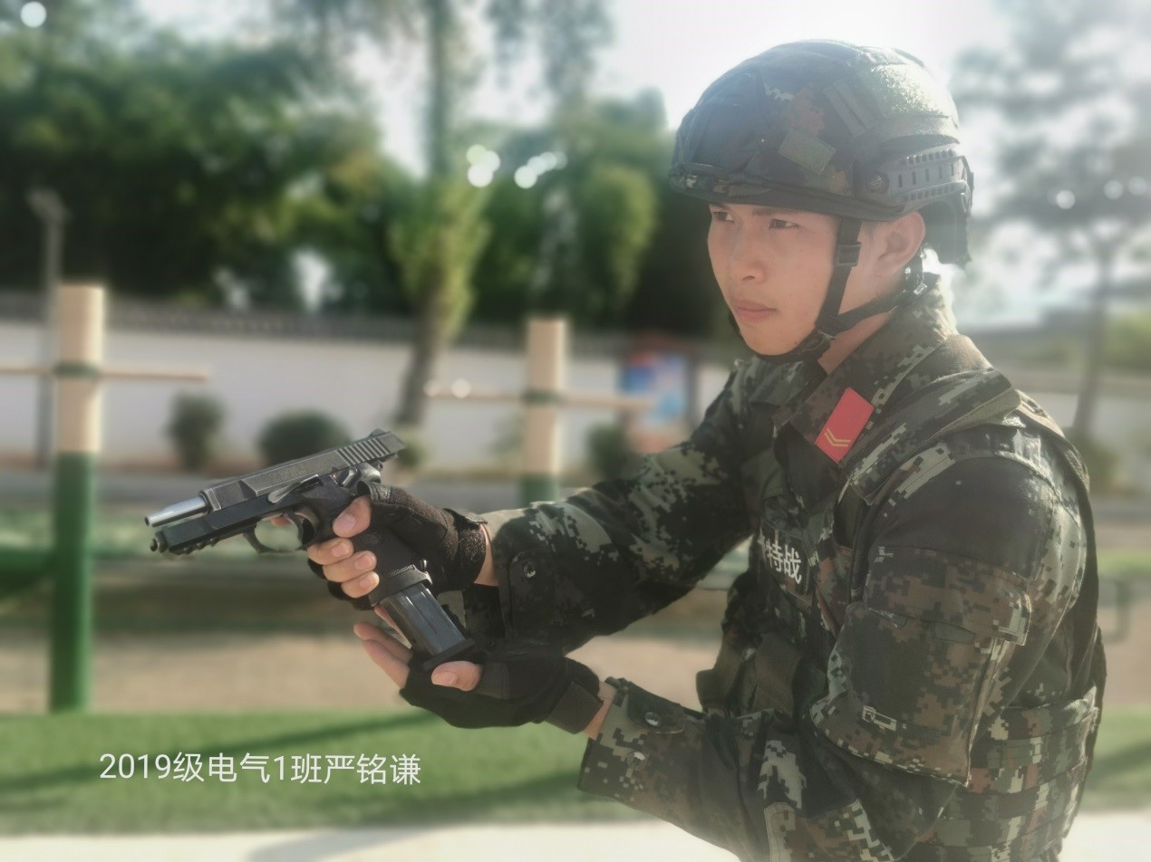 我叫严铭谦,在2020年9月份从武警部队退役,在军营的2年时间对我的人生有着巨大的影响。军营中严格的纪律和制度,使我的思想和言行举止变得更好。每次的摸爬滚打使我的身体承受能力变得更强,每次的负重据枪、攀登使自己的本领更扎实,每次的武装五公里训练不仅提升自己的速度和耐力更使自己的意志力更顽强。四百米障碍,搏击对抗训练,让我学会了“见红旗就扛,见第一就争”,更培养了作为一名军人的血性!回到校园后,我一定不忘初心牢记使命,把部队的优良传统延续在校园。若有战,召必回!