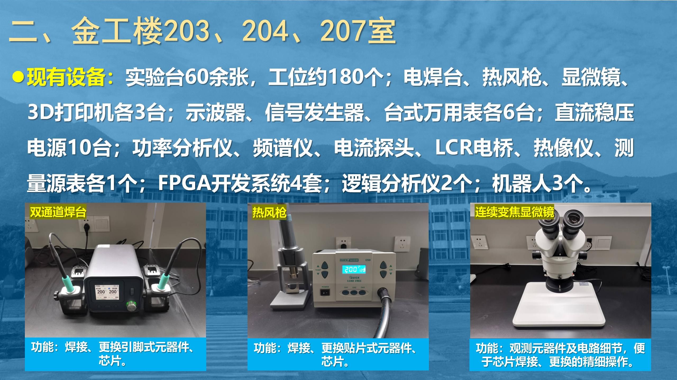 为加强和提高我院各专业学生的创新能力和专业技能及动手能力,学院采购一大批先进实验设备和电子制作设备,供学生创新实践基地(创新活动空间)使用。请大家积极申请预约使用,提高专业技能竞争力。