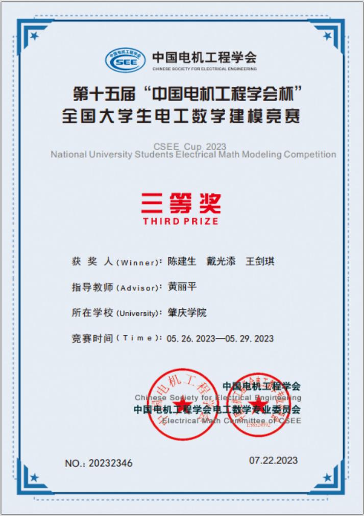 【本网讯】近日获悉,2023年第十五届“中国电机工程学会杯”全国大学生电工数学建模竞赛获奖名单公布,我院2021级电气专业学生陈建生、戴光添、王剑琪三位同学荣获三等奖,指导老师是电气工程系黄丽平博士老师。这是我院学生首次参加该项竞赛并获奖。