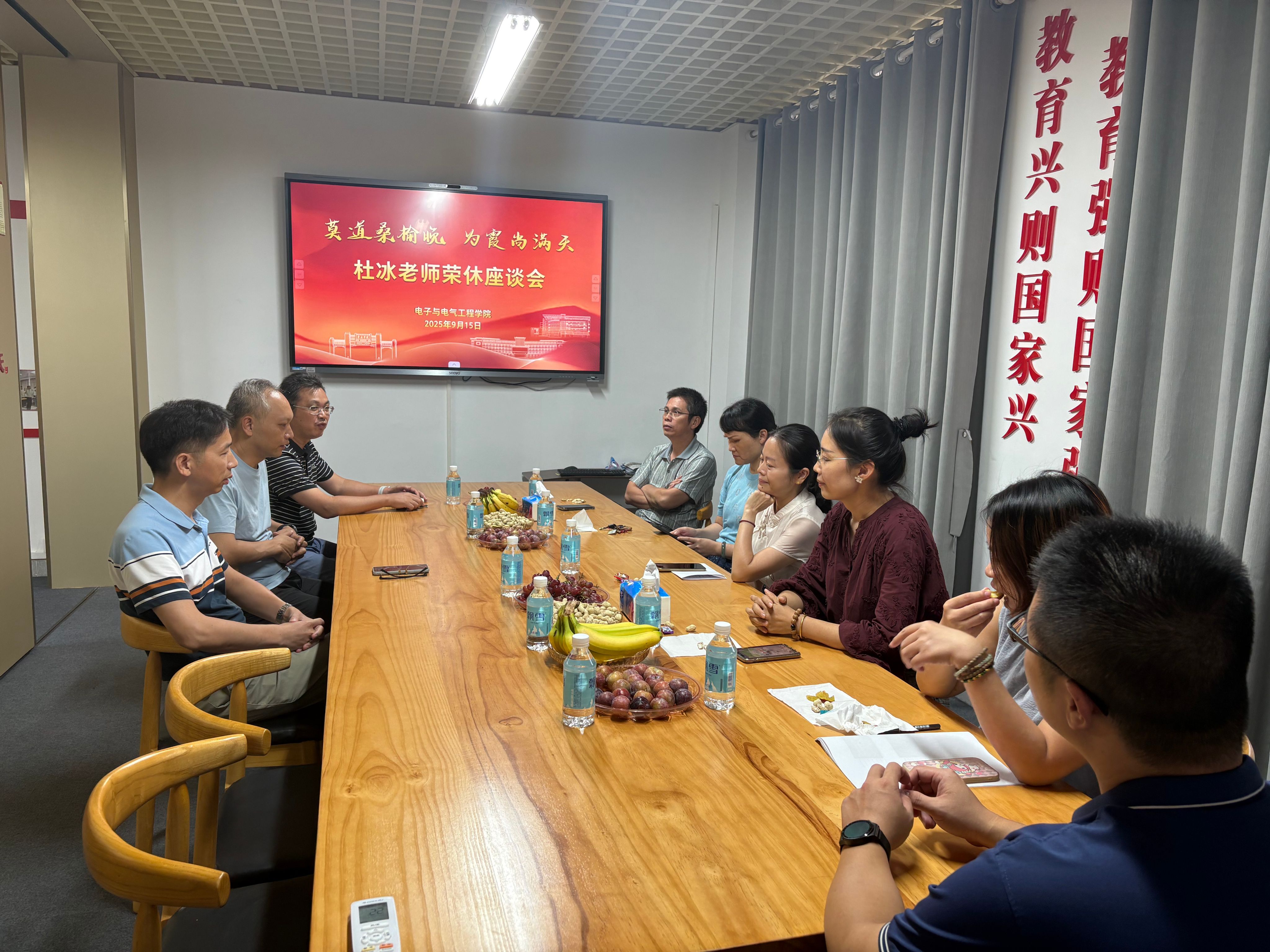 【本网讯】2025年9月15日,电子与电气工程学院为杜冰老师举办了一场温馨而庄重的荣休仪式,学院领导、工会委员和教师代表等齐聚一堂,共同见证这一难忘时刻。