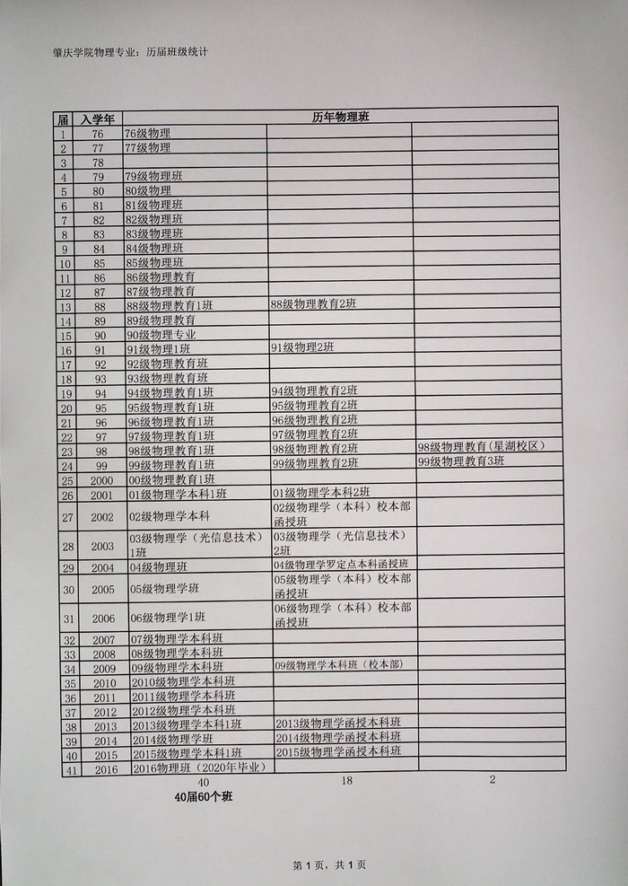 物理专业历届班级情况统计(西大部分)