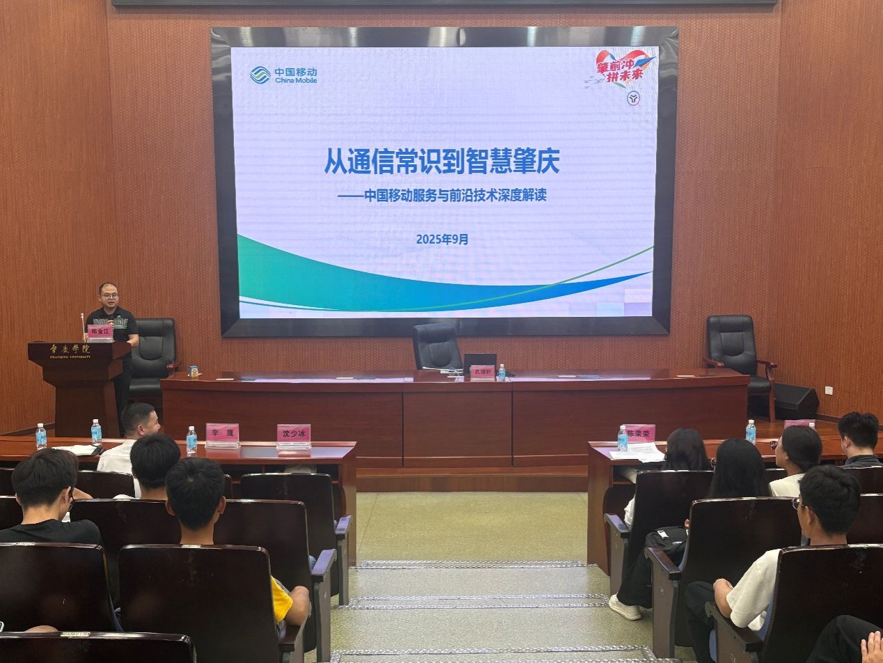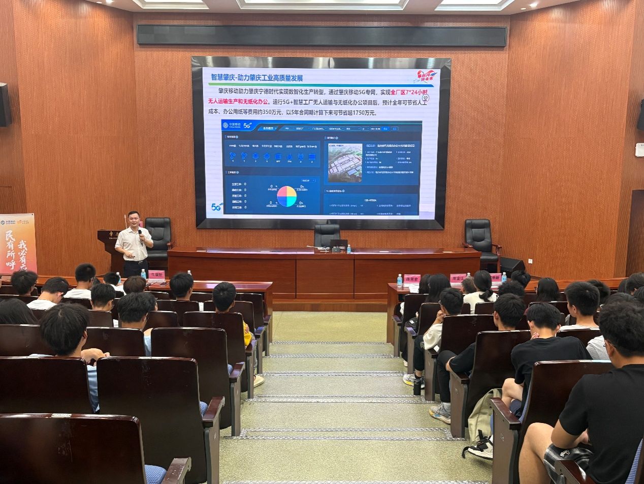讲座中,李鹰、孔瑞轩两位资深专家带来专业分享。李鹰工程师从日常手机通话、上网等通信常识切入,解读中国移动服务承诺与网络运维技术;孔瑞轩工程师聚焦肇庆本地,介绍移动网络覆盖、核心设备情况,并结合案例阐释通信技术在 “智慧肇庆” 建设中的应用,让新生直观感受通信技术的实用价值。